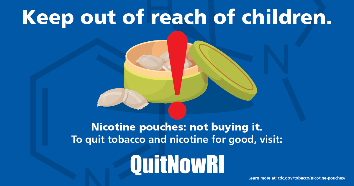 Nicotine pouch poisonings are on the rise among babies and toddlers, who can accidentally swallow the pouches. Quitting is the best way to get these products away from curious children. Can’t seem to quit? Visit QuitNowRI.com for safe and effective quit strategies and talk to your doctor about what might work best for you.